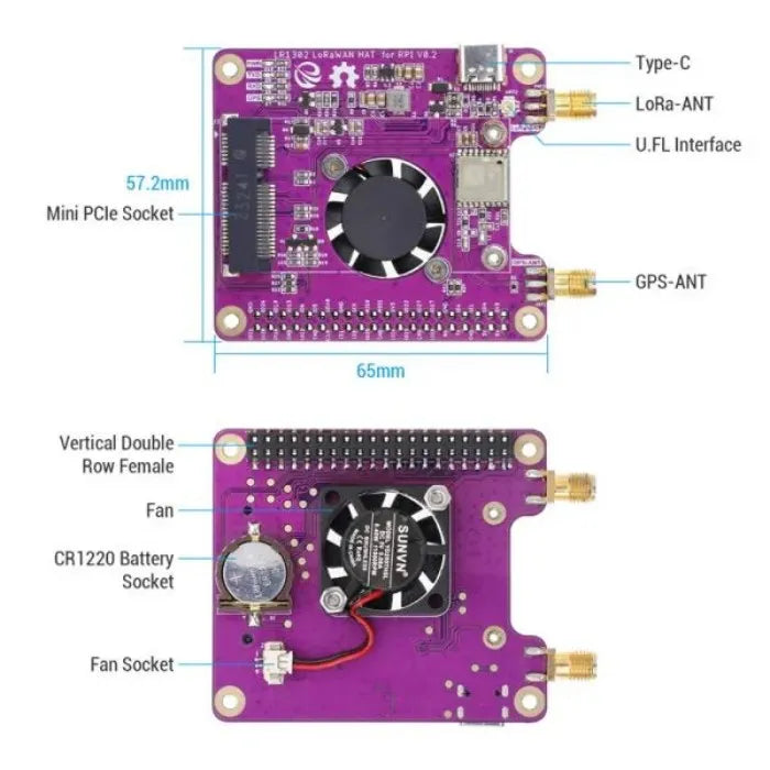 In addition to supporting the mini-PCIe form factor of the LR1302 gateway module, the LR1302 LoRaWAN HAT for RPI automatically routes the standard 52-pin gold finger signals to the Raspberry Pi GPIO connector via a 40-pin compatible header. This architectural design simplifies the development process, allowing users to effortlessly integrate long-range wireless functionality into their Raspberry Pi projects. Furthermore, it features an integrated cooling fan to provide active thermal management, ensuring stable performance for the Raspberry Pi during intensive data processing.