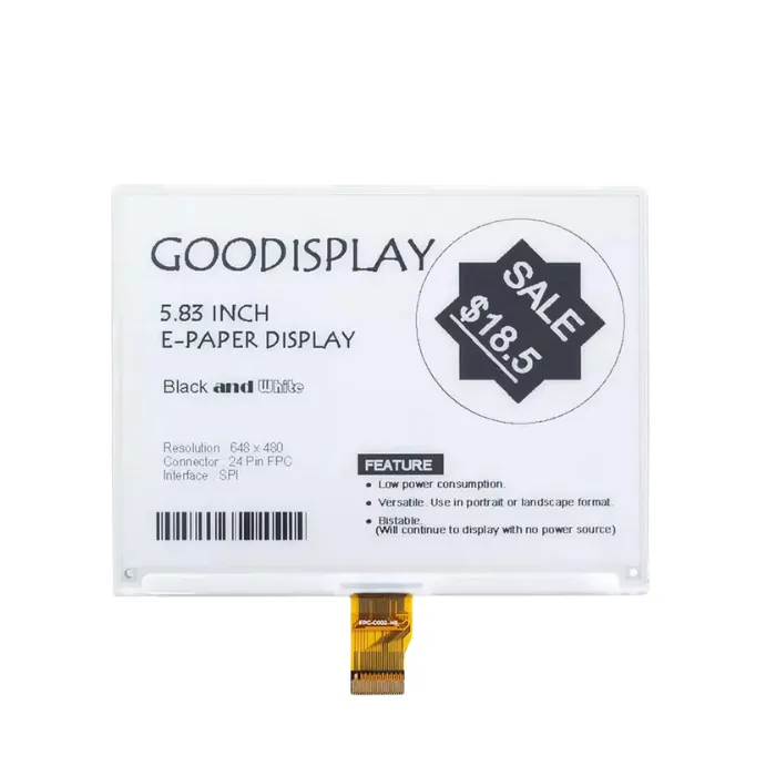Discover the GooDisplay GDEY0583T81, a cutting-edge 5.83-inch electronic paper module engineered for exceptional power efficiency. Leveraging innovative E-Ink technology, this display delivers crisp, paper-like visual quality that remains stable without continuous power supply. Its bistable nature ensures content persistence even when disconnected, making it an outstanding choice for battery-dependent devices and mobile implementations. The superior resolution combined with expansive viewing capabilities positions this module as an excellent solution for electronic shelf labels, static information panels, and embedded display systems.
