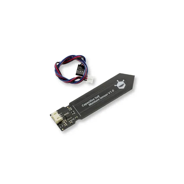 Gravity: Capacitive Soil Moisture Sensor is ideal for environmental science courses and indoor gardening applications. Operating within a voltage range of 3.3 to 5.5V, this sensor provides an analog output of 1.2 to 2.5V, making it compatible with low-voltage MCUs, including both 3.3V and 5V logic systems, allowing for easy integration with popular platforms such as Arduino and Raspberry Pi. It features a waterproof detection area, effectively measuring soil moisture levels while resisting corrosion for reliable performance in outdoor and controlled environments. The capacitive design offers 2-3 times the lifespan of resistive sensors, ensuring long-term durability and dependable monitoring.
