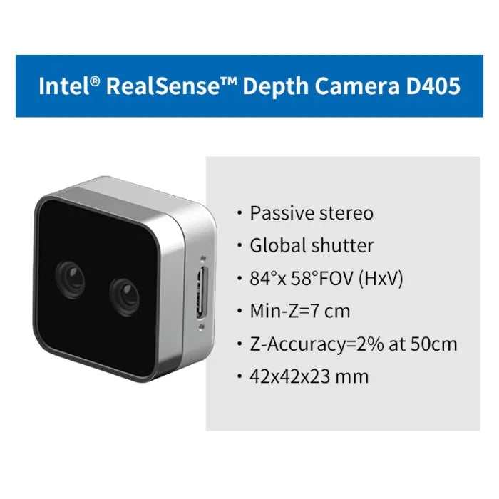 The Intel RealSense D405 is a next‑generation close‑range stereo depth camera engineered for applications requiring sub‑millimeter accuracy at distances as short as 7 cm. With its global‑shutter depth sensors, 87° × 58° field of view, and advanced onboard image processing, the D405 delivers exceptionally precise 3D depth data for robotics, inspection, agriculture, and medical applications. Its compact 42 × 42 × 23 mm form factor and lightweight 60 g design make it ideal for embedded systems and space‑constrained environments.