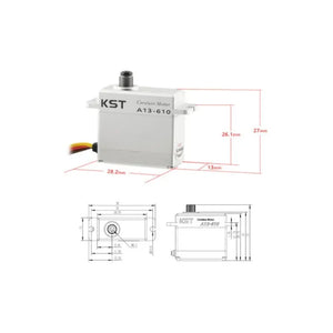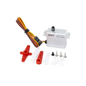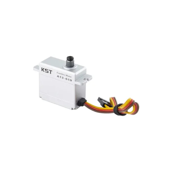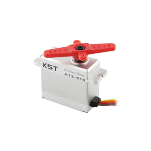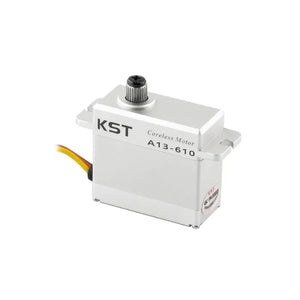 A13-610 is a medium to high voltage range metal cased servo with excellent speed and torque specifications. The KST A13-610 has a hardened steel drive train and a coreless motor capable of running all the way from 4.8V to 8.4V (4S NiMH to 2S LiPo) making these servos ideal for electric powered models (most ESCs output 5.5V) as well as most gliders.