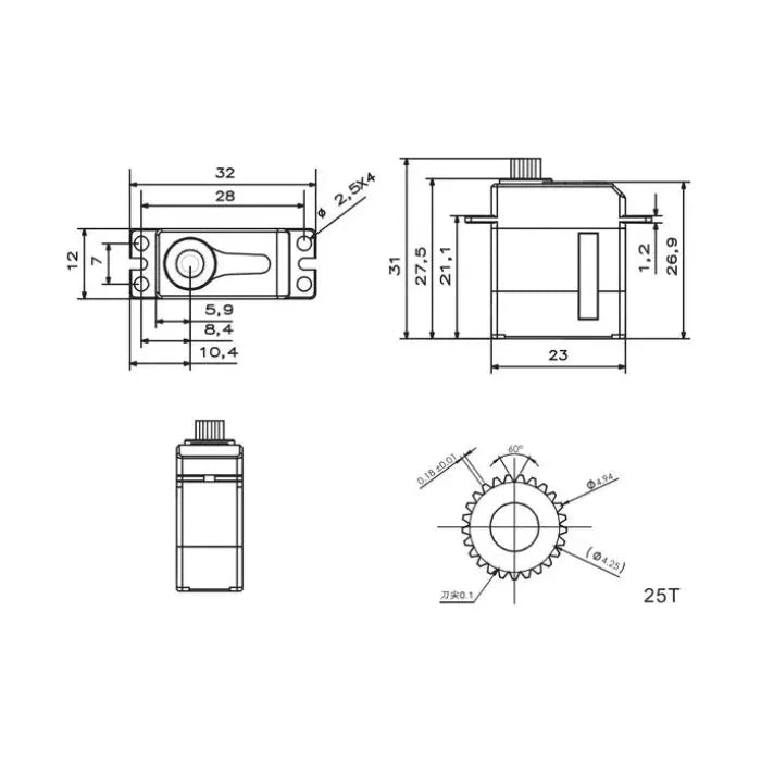 - Speed: 0.10sec/60°@6.0V, 0.09sec/60°@7.4V