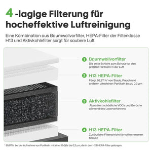 Working together, these layers deliver powerful purification and remove up to 99.97 percent of particles down to 0.3 microns that pass into the H13 HEPA core. This supports healthier working conditions during long engraving sessions and keeps the air in your workspace noticeably fresher.