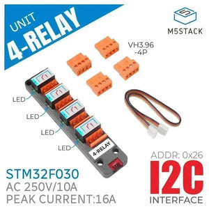 Each relay can be controlled separately, and the unit features programmable status LEDs that provide clear visual feedback on the on/off state of each relay. This makes it easy to monitor and manage connected loads in real time. With its Grove interface, the 4-Relay Unit integrates seamlessly with M5Stack controllers and other I2C-compatible microcontrollers, offering flexible and reliable control for a wide range of applications.