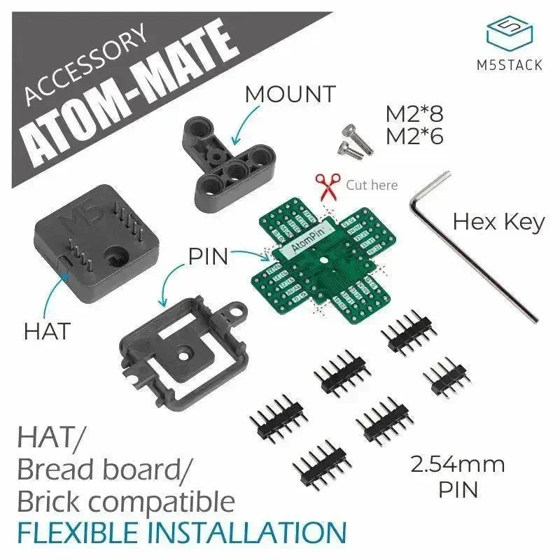 The ATOM MATE is a versatile DIY expansion kit designed specifically for the M5Stack ATOM series 🔌. It includes three modular accessories to enhance connectivity, compatibility, and mounting flexibility for your projects.