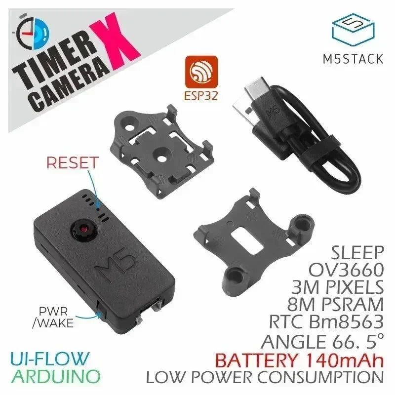 Timer Camera X is a camera module based on ESP32, integrated with ESP32 chip and 8M-PSRAM. The camera (ov3660) with 3 million pixels, DFOV 66.5 ° and 2048x1536 resolution photos, a built-in 140mAh battery, and an LED status indicator, featuring an ultra-low power consumption design. There is a reset button under the LED. Through RTC (BM8563), timing sleep and wake-up can be realized. The standby current is only 2μA. After timing photo taking function(one photo per hour) is turned on, the battery can work continuously for more than one month. The module supports Wi-Fi image transmission and USB port debugging. The bottom HY2.0-4P port output can be connected to other peripherals. Through M5Burner burning firmware, esp32 cam can be set directly with Camera-Tool, and Timer Camera X data can be processed in UIFlow.