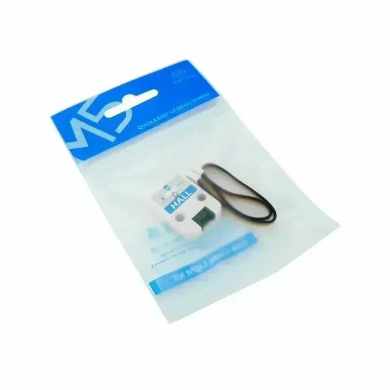 The M5Stack Hall Effect Unit is a compact magnetic field sensing module that integrates three A3144E Hall sensor switches processed by 74HC series gate ICs. It generates a low-level signal when a magnet’s S pole is close to the sensor’s top or the N pole is close to the back, with a built-in LED indicator providing intuitive status feedback.