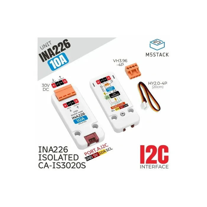 The M5Stack INA226‑10A Unit is a fully isolated, high‑precision measurement module designed for monitoring DC voltage (0–30 V) and current up to ±10 A. It enables simultaneous acquisition of voltage and current data and calculates real‑time power consumption.