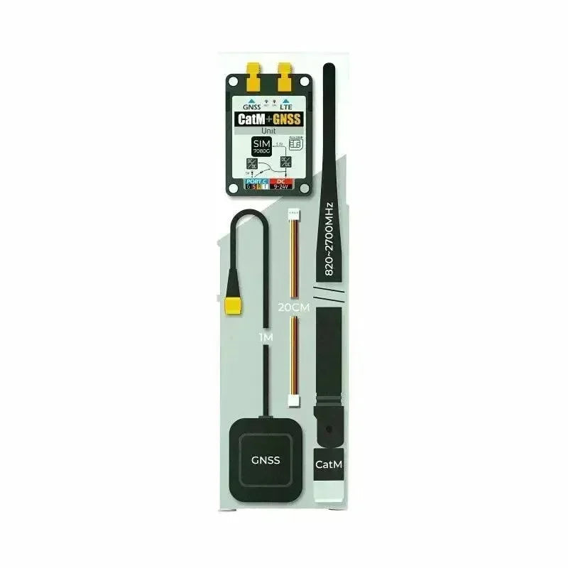 The CatM+GNSS Unit is a global wireless communication module supporting both CAT‑M (Category M) and NB‑IoT (Narrowband Internet of Things) dual‑mode connectivity. Powered by the SIM7080G module, it operates on CAT‑M and NB‑IoT bands worldwide, ensuring compatibility with diverse cellular networks.