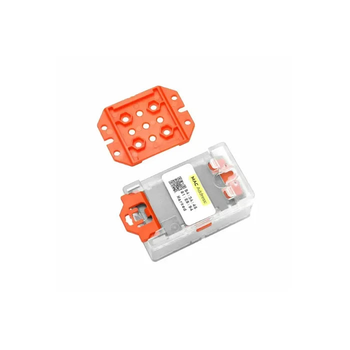The MAC address (equivalent to the product's unique ID) is shown on the sticker on the back of the product. As shown above, pull the small hook forcefully and lift the cover to see it. In addition, you can also program the master device to scan and read the MAC address included in the status information broadcasted by SwitchC6; the specific method is described in the Arduino development section.