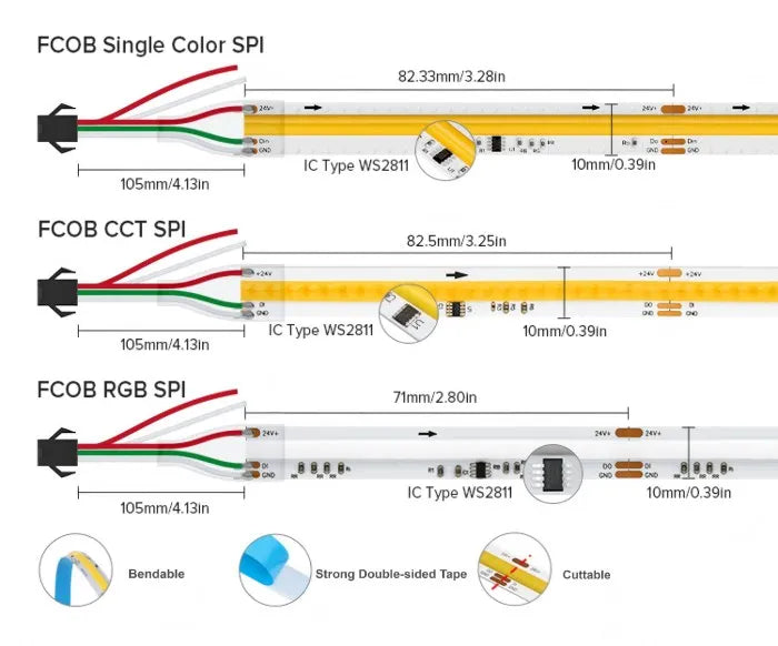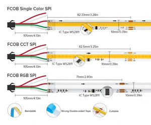 | Power per Meter | - RGB: 12W<br>- Single Color: 12W<br>- Dual Color Temp: 10W |