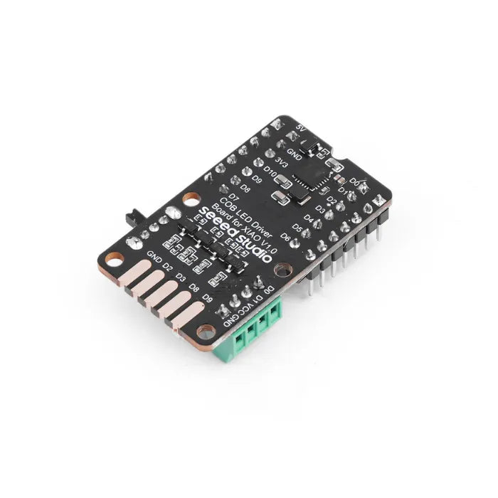 The Seeed Studio COB LED Driver Board integrates seamlessly with the XIAO series, offering a compact footprint while expanding GPIO capabilities. Its design includes screw terminals for high-power channels and bottom pads for low-power outputs, making it versatile for different COB LED configurations.