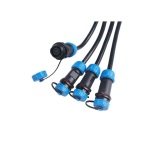The Sensor Hub has 4 aviation connector interfaces through which sensors can be connected. Each of these interfaces can theoretically support up to 8 sensors. For connecting more than 4 sensors, the RS485 1-to-4 splitter is required. One interface (male) of the RS485 splitter can connect to the Sensor Hub, and the other 4 interfaces (female) can connect to the sensors.