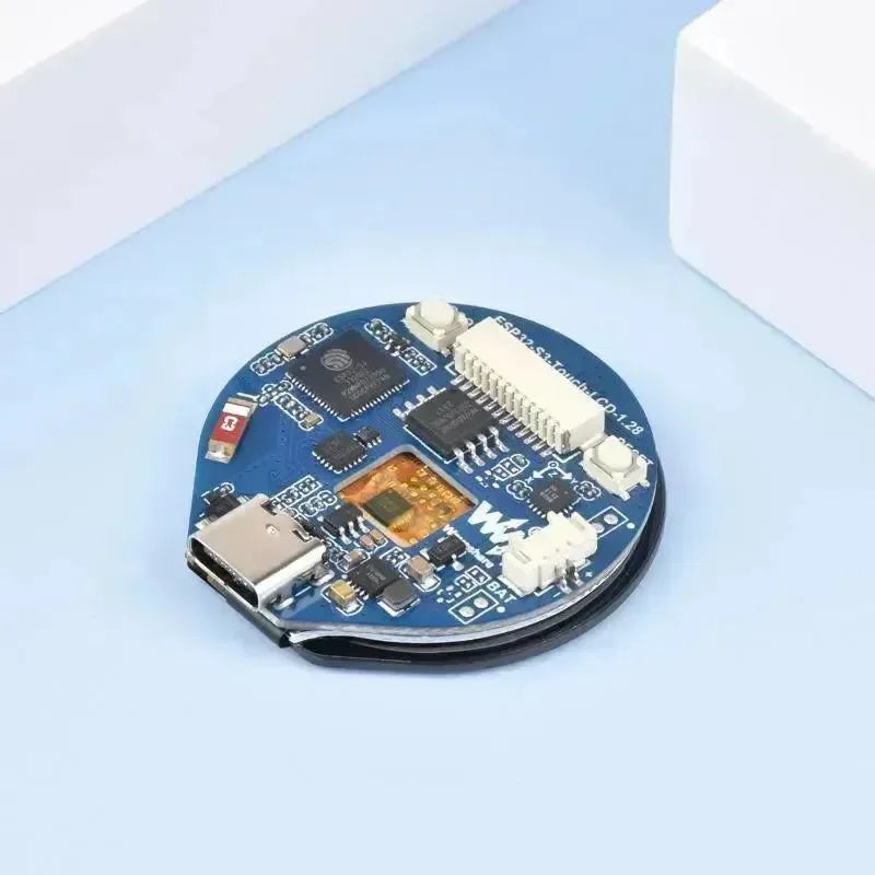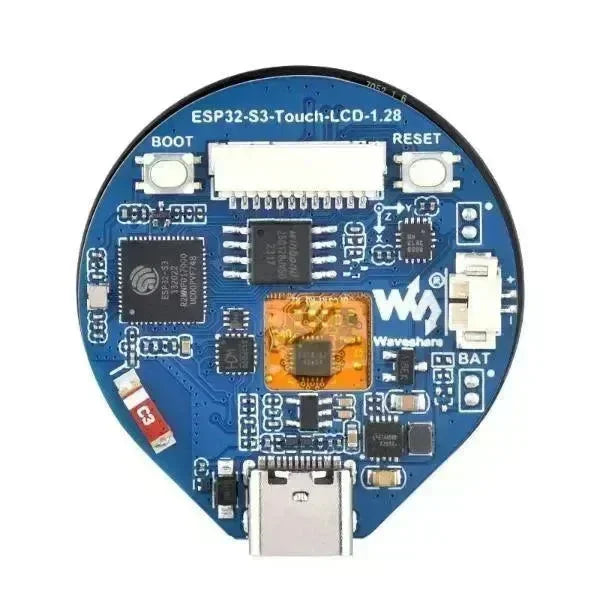 The ESP32-S3-Touch-LCD-1.28 is a low-cost, high-performance microcontroller development board designed by Waveshare. In a small form factor, the board contains a 1.28-inch capacitive touch LCD screen, a Li-ion battery charging chip, six-axis sensors (three-axis accelerometer and three-axis gyroscope) and other peripherals, which make it easy to develop and embed the application into the product.