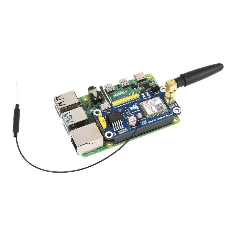 The **SIM800C GSM/GPRS HAT** is a handy, low power Raspberry Pi HAT which features multi communication functionalities: GSM, GPRS, and Bluetooth, with up to 85.6kbps GPRS data rate.