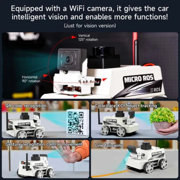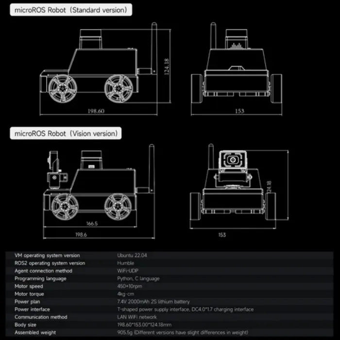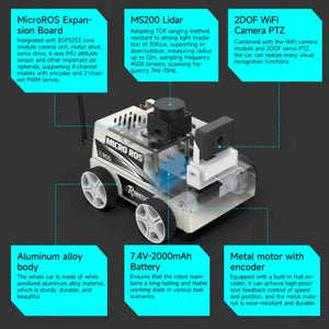 This ROS educational robot car migrates complex computing tasks to a PC virtual machine environment, eliminating the need for an embedded development board (Jetson NANO/Raspberry Pi) as the main controller, while remotely transmitting data via MicroROS WIFI UDP from the ESP32 co-processor for efficient calculations and decision making; Yahboom equips 4 encoder motors at 310 rpm, a 7.4V high-capacity battery, a professional MicroROS control board, TOF lidar, and other accessories, all running ROS2-Humble with Python3 to enable obstacle avoidance, following, mapping/navigation, RVIZ simulation, multi-machine synchronization control, and seamless RVIZ/APP integration for robust, scalable educational robotics and autonomous navigation.