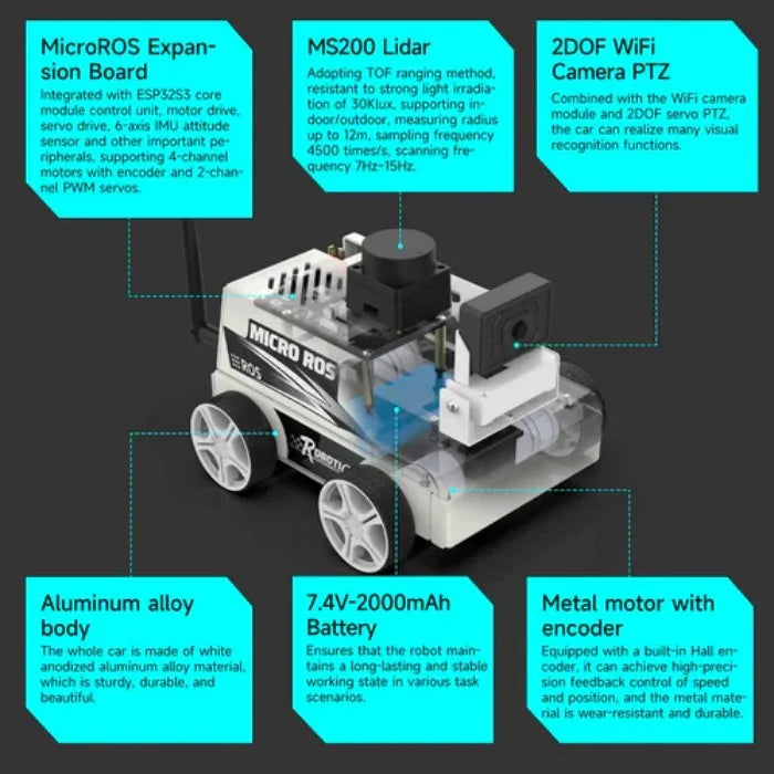 - The chassis is made of aluminum alloy, equipped with a 310 encoder motor and a 7.4V high-capacity battery, offering a sleek appearance and excellent quality.