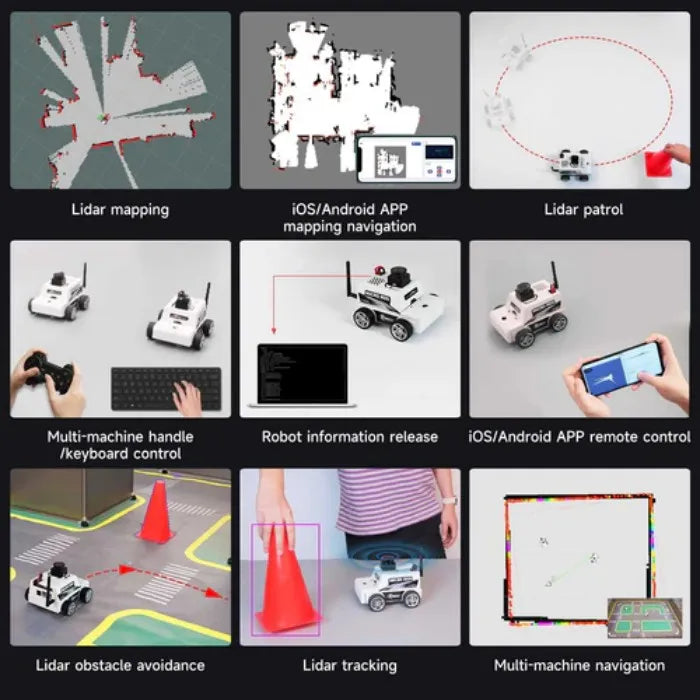 - Lidar obstacle avoidance, following, mapping/navigation, RVIZ simulation, multi-machine synchronization control, APP/handle remote control, and other functions are all supported.