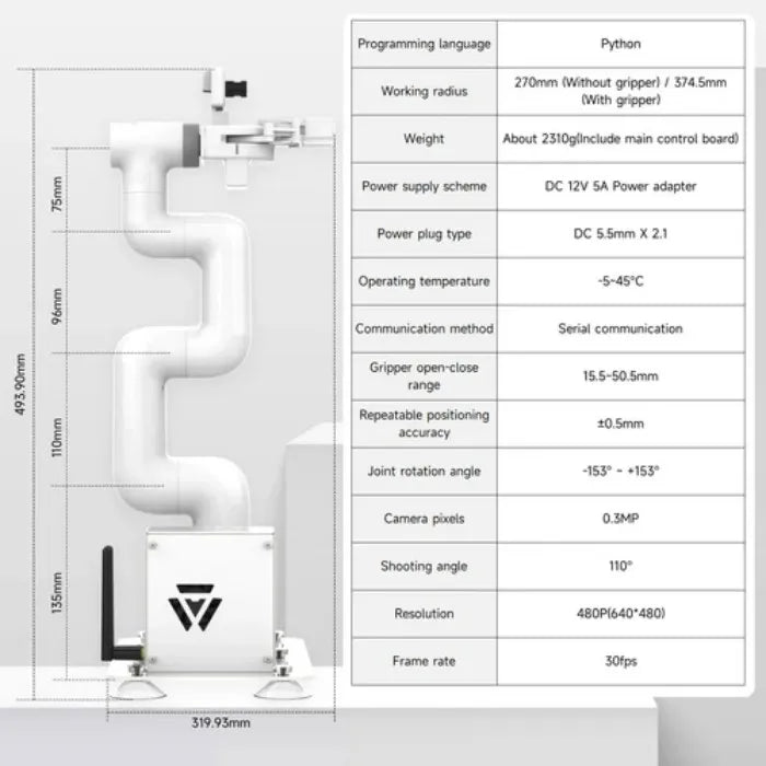 Equipped with a 0.3 MP USB camera that offers a 110° field of view, JetCobot integrates OpenCV image processing, machine vision, and deep learning algorithms. This allows it to perform functions such as color interaction, face tracking, tag recognition, model training, and gesture interaction.
