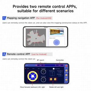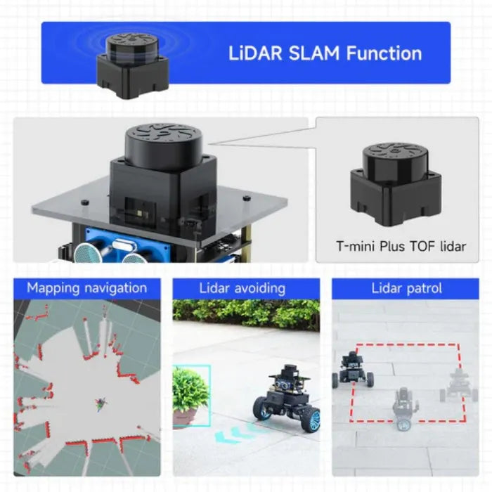 - Supports SLAM mapping navigation, lidar/ultrasonic obstacle avoidance and following, with data displayed on OLED.