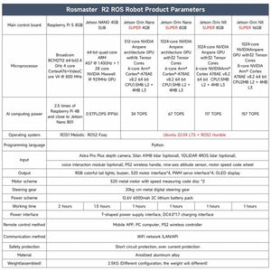 Introducing the ROSMASTER R2, an innovative mobile robot platform engineered with an advanced AI voice interaction system and precision Ackermann steering, all powered by the robust ROS2 framework. This versatile robot is compatible with a range of powerful main control boards, including Jetson NANO (B01/SUB), Jetson Orin NANO SUPER, Jetson Orin NX SUPER, and Raspberry Pi 5.