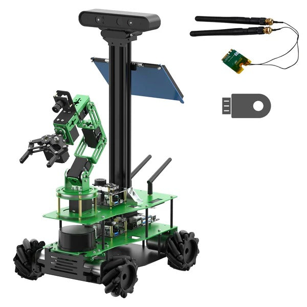The ROSMASTER X3 PLUS represents a cutting-edge omnidirectional robotic platform built on the Robot Operating System framework. This versatile robot offers seamless compatibility with multiple processing units including Jetson NANO 4GB, Jetson Orin NX SUPER, Orin NANO SUPER, and Raspberry Pi 5. The system integrates premium components such as LiDAR sensors, depth-sensing cameras, a 6-degree-of-freedom manipulator, powerful 520 motors, voice interaction technology, and a crystal-clear 7-inch HD touchscreen. Experience advanced capabilities including autonomous mapping, self-driving navigation, facial recognition, moveIt arm simulation, and synchronized multi-robot operations. Control flexibility extends across smartphone apps, gamepad controllers, and keyboard interfaces. Comprehensive bilingual video guides and source code come included at no additional cost.